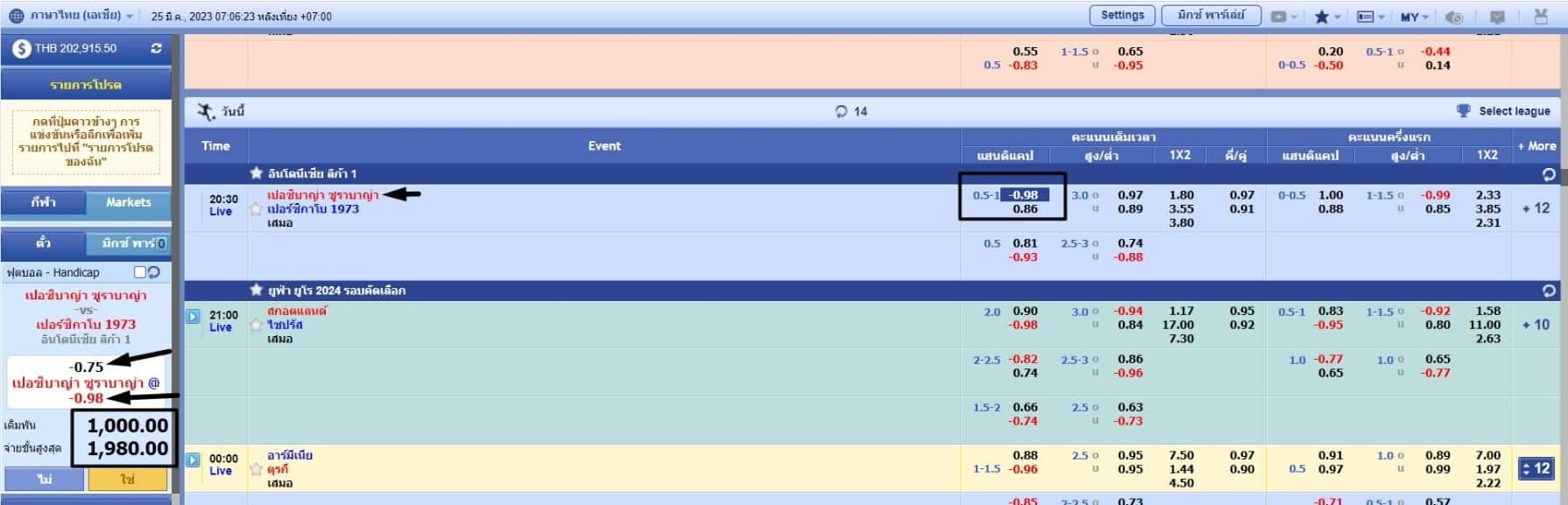 จากรูปด้านบน เล่นบอลเดี่ยว แทงทีมต่อ1000 ราคาบอล-0.75 ราคาบอลต่อครึ่งควบลูก หากบอลจบผลออก 3-2 ทีมต่อชนะ1ลูก หมายความว่า หากทีมต่อชนะ1ลูกจะได้ครึ่ง = แทง1000 ได้500 ตามราคาบอล-0.75 นั่นเอง ส่วนค่าน้ำ -0.98 หมายความว่า หากทีมที่แทงแพ้จะเสีย 980 บาท