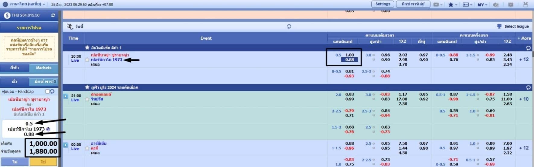 รายการแทงบอลเดี่ยว หากทีมที่แทงชนะ ราคาค่าน้ำ0.88 บอลต่อ 0.5(ครึ่งลูก.) เดิมพัน1000 คือ เอา1000*0.88=880 บวกทุน1000 เท่ากับ ได้1880บาท